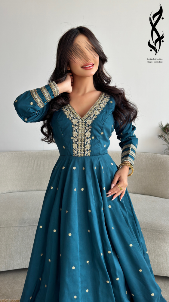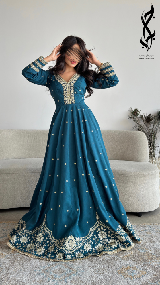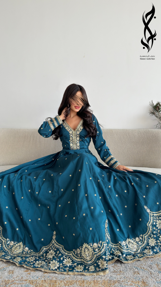 تألقي بإطلالة فريدة وساحرة مع جلابية هندية باللون الأزرق التركواز من متجر جلباب، المصممة لتمنحك لمسة من الفخامة والرقي في المناسبات الراقية مثل حفلات الحناء والجلوات. تتميز هذه الجلابية بتطريز ذهبي فاخر ولمسات شك يدوي تضيف لها جمالًا استثنائيًا.