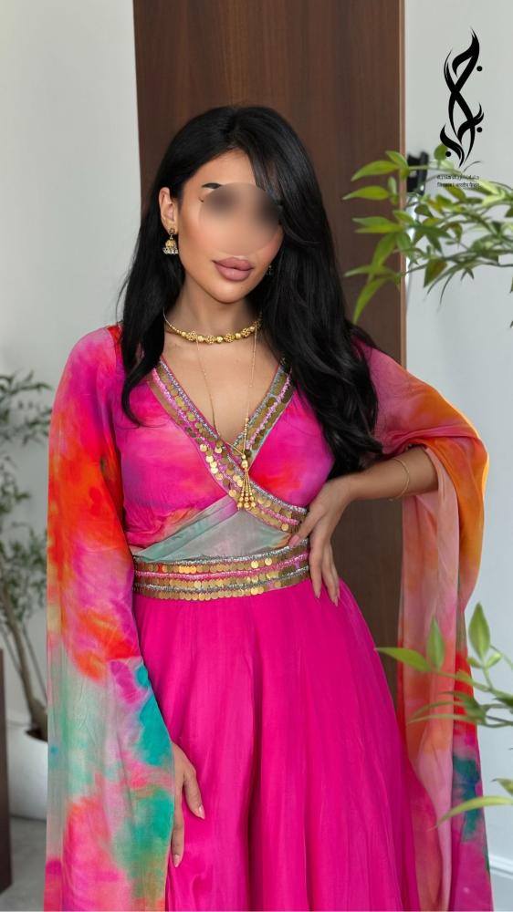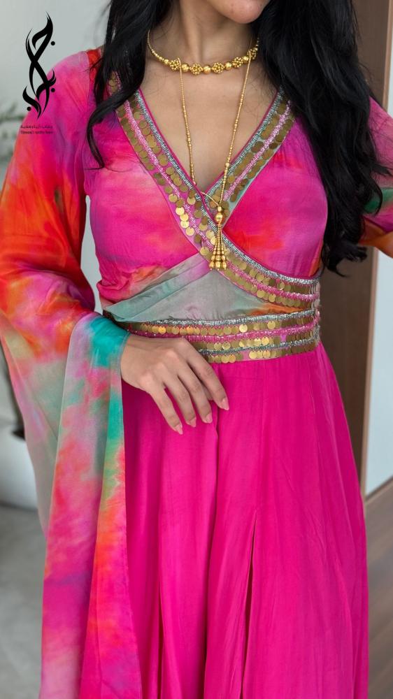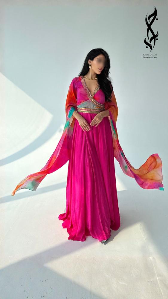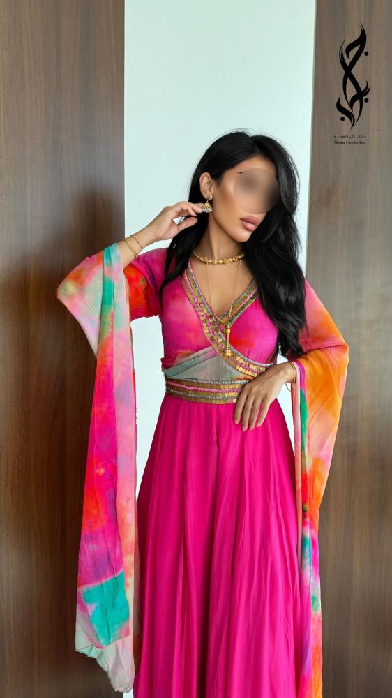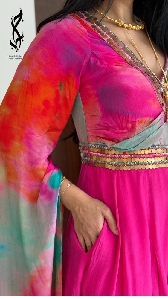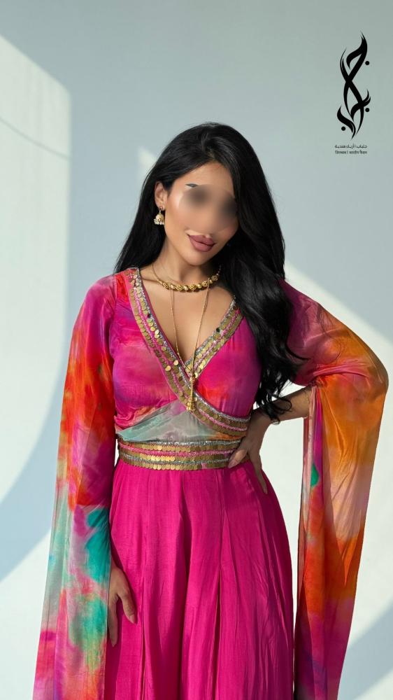 يتميّز بتصميم الكروس الراقي عند الصدر مع حزام مطرّز يبرز الخصر بأسلوب أنثوي جذّاب، فيما تضيف الأكمام الشفافة المتدرجة بالألوان لمسة فنية تعكس روح التفرّد والفخامة.
