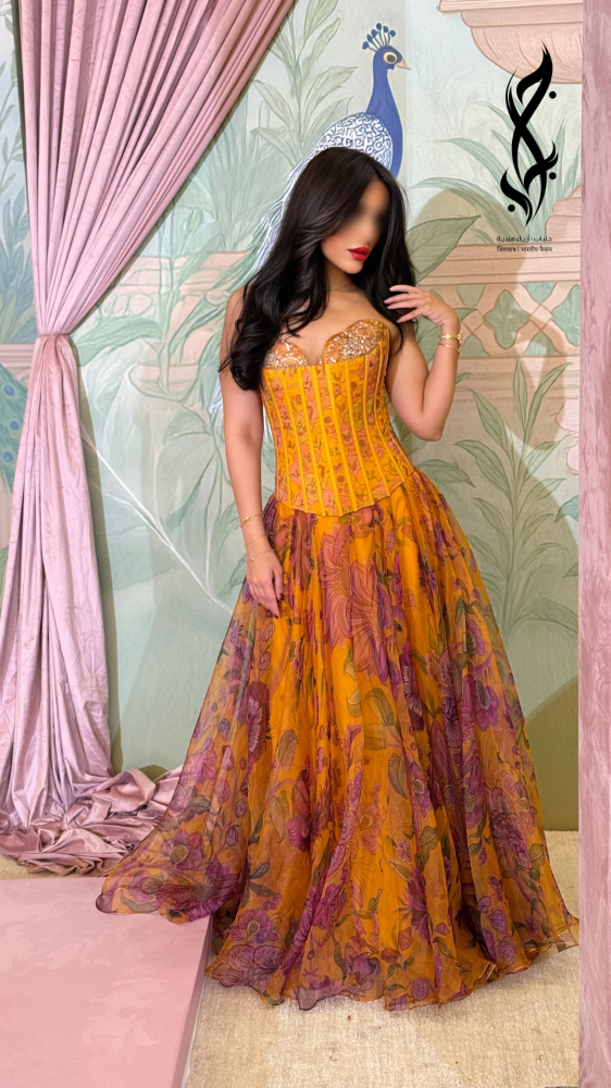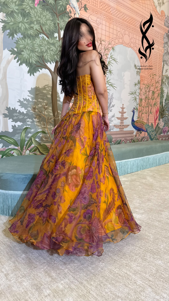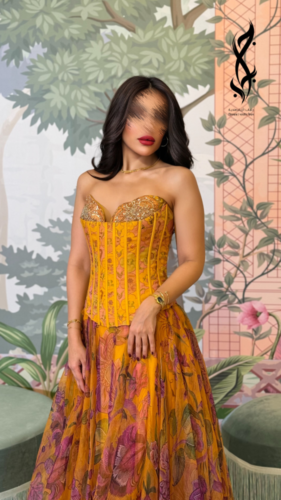 الفخامة والأناقة مع هذا الطقم الهندي الراقي بلون أصفر مشرق والمزيّن بتفاصيل زهرية ملونة. يتميز الفستان بقصة كورسيه ضيق يبرز الخصر، وتنورة واسعة متصلة من الشيفون بطبعات وتطريزات فنية نابضة بالحياة.