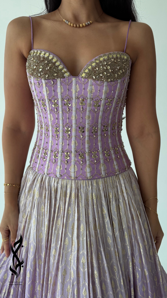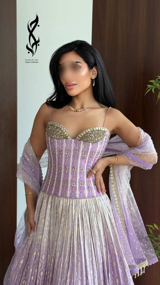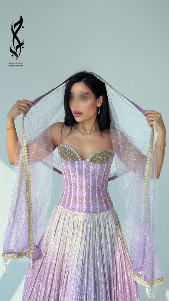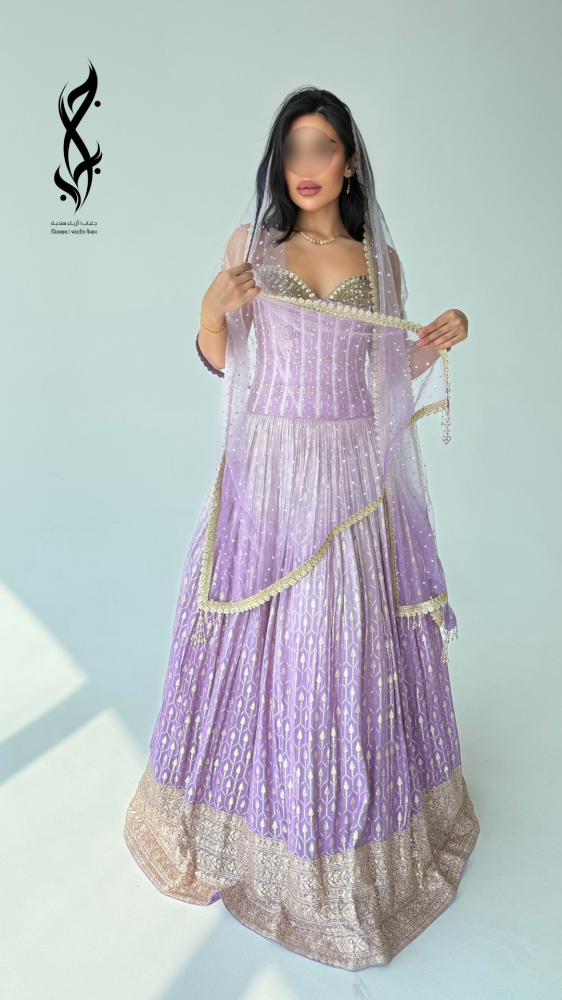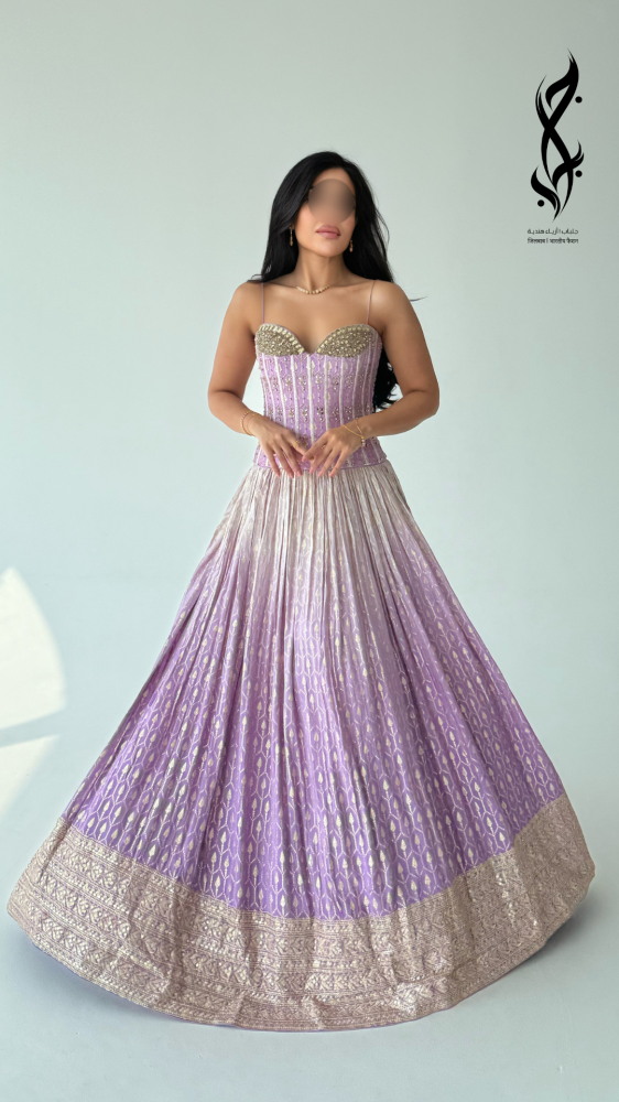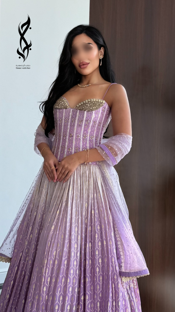 الفخامة والأناقة مع هذا الطقم الهندي الراقي بلون البنفسجي لافندري والمزيّن بتفاصيل من الذهبي والفضي . يتميز الفستان بقصة كورسيه ضيق يبرز الخصر، وتنورة واسعة متصلة من الشيفون بطبعات وتطريزات فنية نابضة بالحياة.